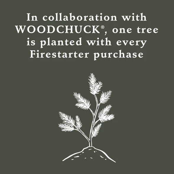 Light a fire with ease and purpose! In collaboration with Woodchuck USA®, one tree is planted with every Firestarters purchase! Track a tree's impact and location online using the supplied code.