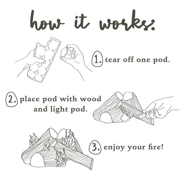 Our Firestarters are perfect for fireplaces, wood stoves, campfires, and more. You'll never need kindling again. Simply tear off a fragranced pod, place among wood and light. Each Firestarters package contains 10 pods.